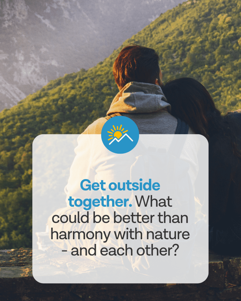 What could be better than harmony with nature — and each other? Sometimes a change of scenery is all that is needed to spark conversations. Togetherness outdoor activities could mean a ropes course, cycling, gardening, or simply walking trails together. The possibilities are only limited by your energy and imagination.